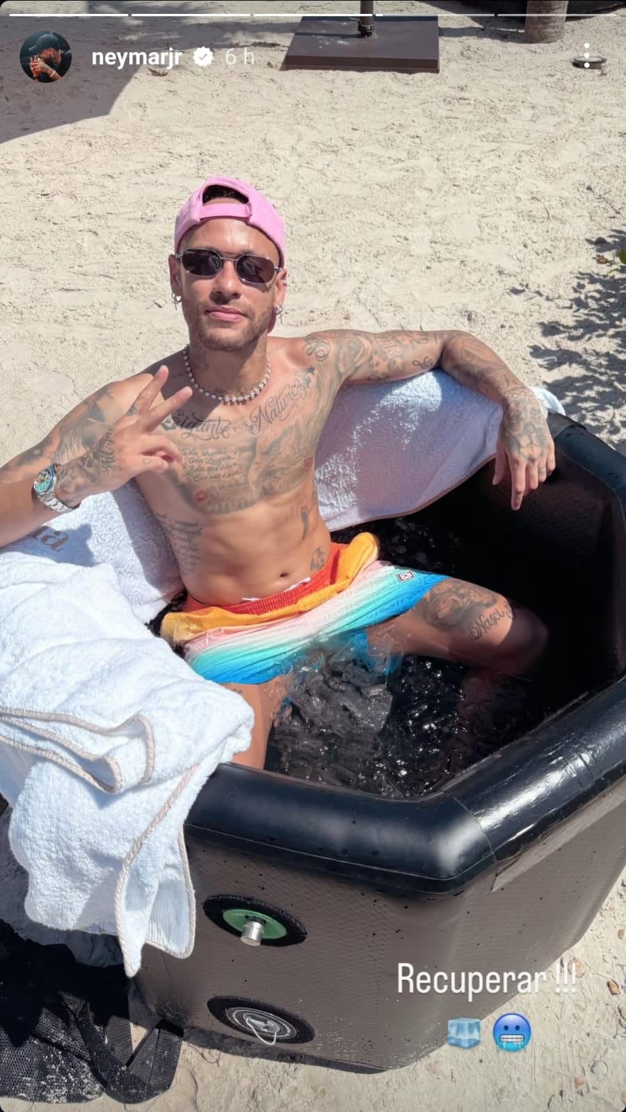O atacante está em Mangaratiba, no Rio de Janeiro, onde possuí uma casa em condomínio fechado. Ele publicou uma foto em suas redes sociais com seu filho Davi Lucca e em outro registro o craque aparece em uma banheiro de gelo com a legenda "Recuperar".