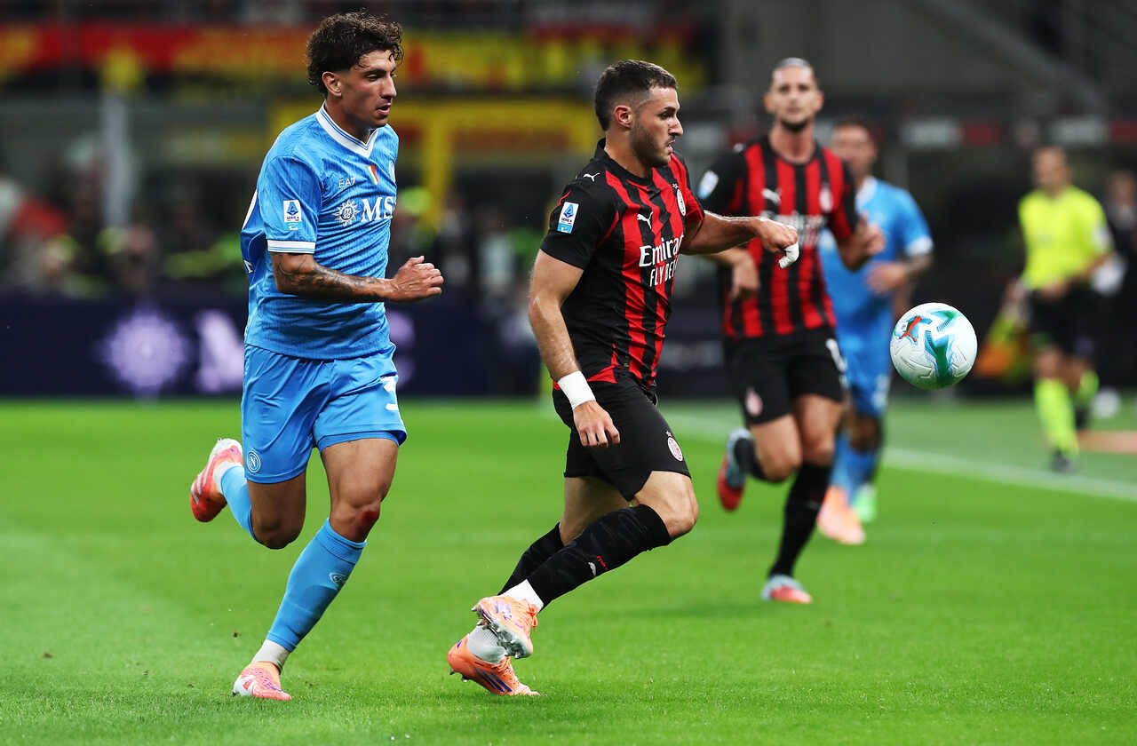 Santiago Giménez, do Milan, em disputa de bola com Milinkovic-Savic, do Napoli – Foto: Marco Luzzani/Getty Images