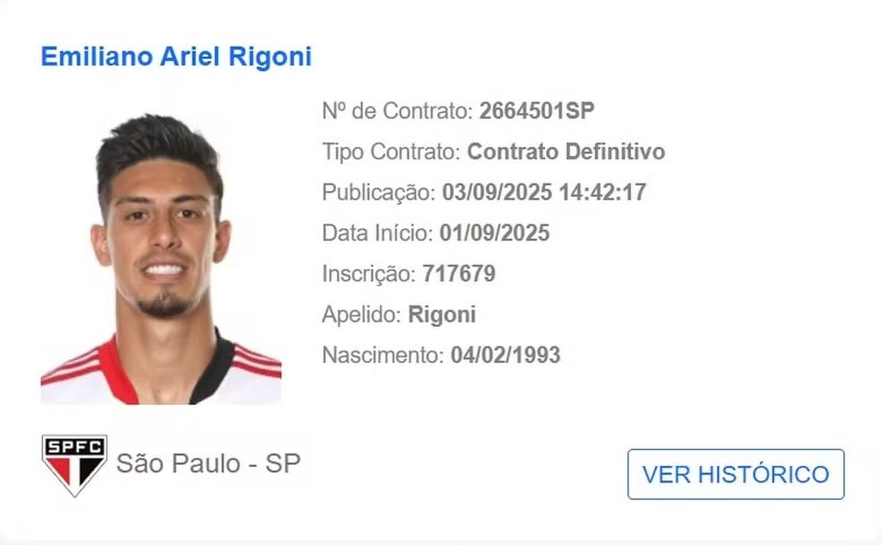 Nesta quarta-feira (03), o nome do atacante Emiliano Rigoni apareceu no BID (Boletim Informativo Diário) da CBF. Com isso, o argentino está liberado para estrear pelo São Paulo, sob o comando de seu compatriota Hernán Crespo.